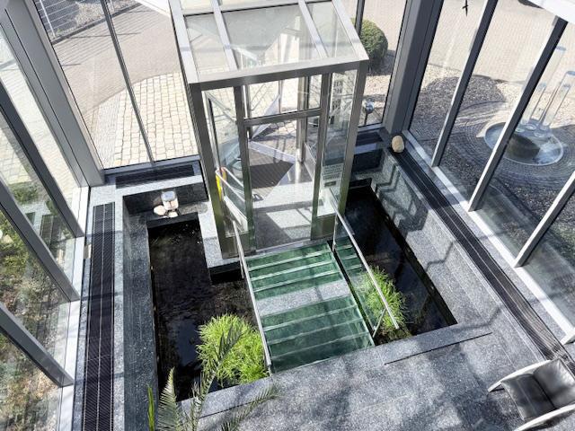 Das Gebäude verleiht schon beim Betreten des Eingangsbereichs, durch den im Boden eingelassenen Teich und die modernen Verglasungen, einen ganz besonderen Charme.