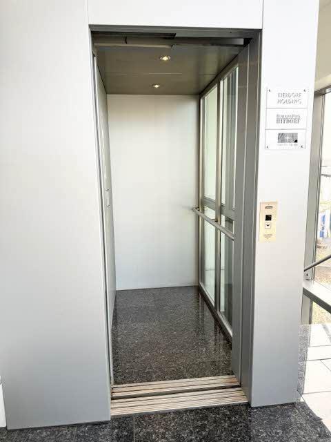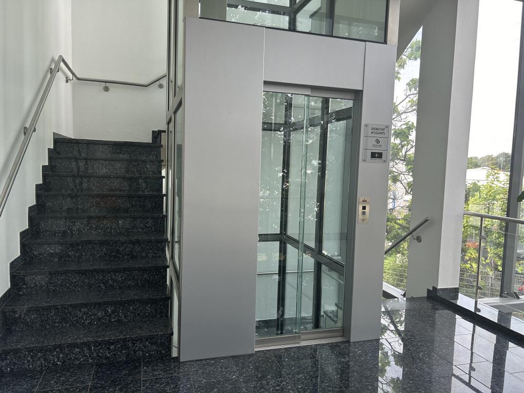 Zu der Fläche gelangen Sie über einen modernen Glasaufzug oder das Treppenhaus.
