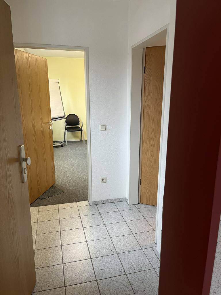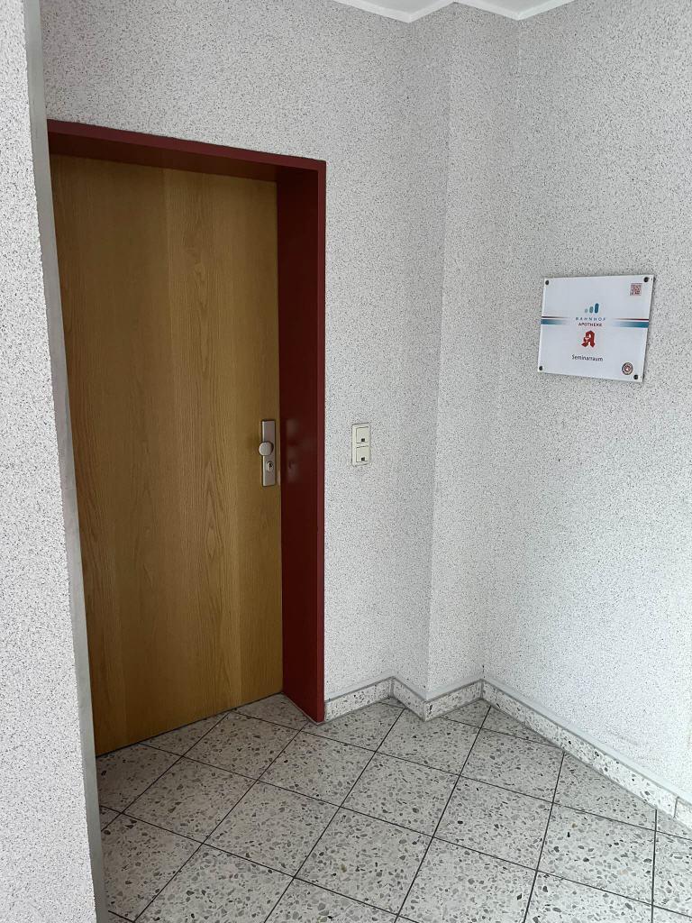 Kleiner Eingangsbereich (Flur), separate Küche mit Einbauküche, Zugang zu großem Seminarraum über Flur und Küche, Zugang zur südlich gelegenen Terrasse, weiteres Büro/Lager, kleiner Archivraum, vollwertiges Badezimmer mit Badewanne und WC