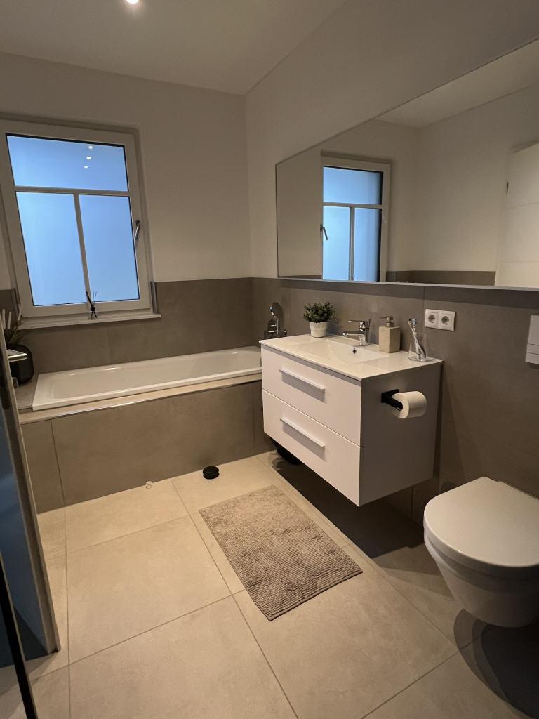 Im hochwertigen Badezimmer gibt es eine Wanne sowie eine bodentiefe Dusche.