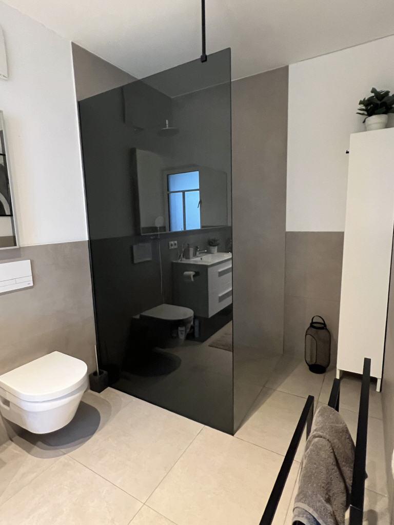 Im hochwertigen Badezimmer gibt es eine Wanne sowie eine bodentiefe Dusche.
